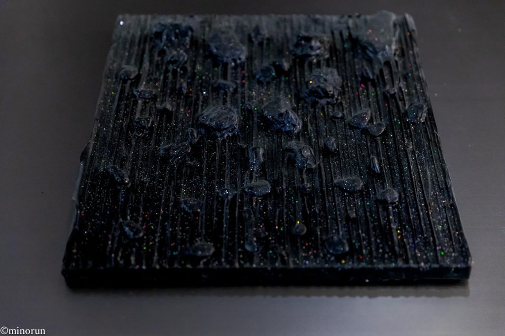 「太陽と雨」は、絵の具を何層も重ねて削っていく中で、地層のような感じが出てきたことからつけたタイトルです。制作していた時期の気候も影響していますし、読んでいた本からの影響もあります。